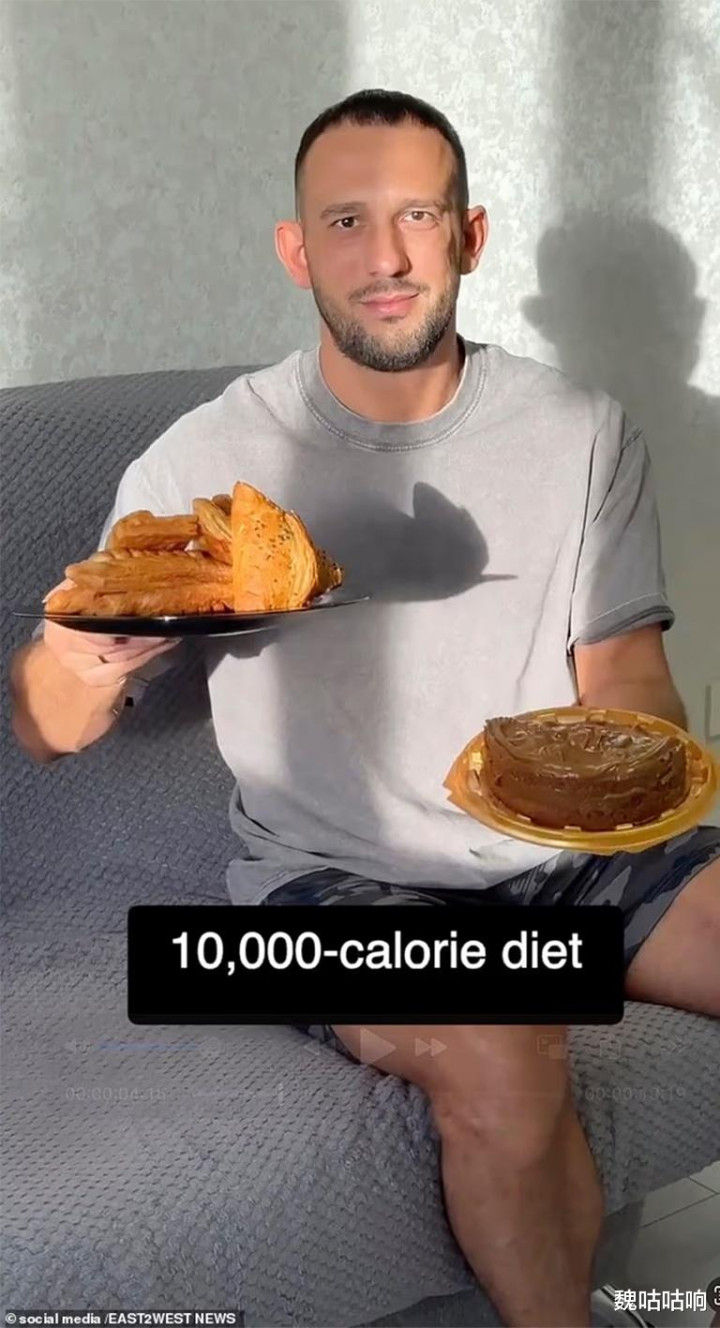 他的计划简单粗暴:每天摄入高达10,000卡路里的食物。这相当于普通成年男性5天的热量总和。
