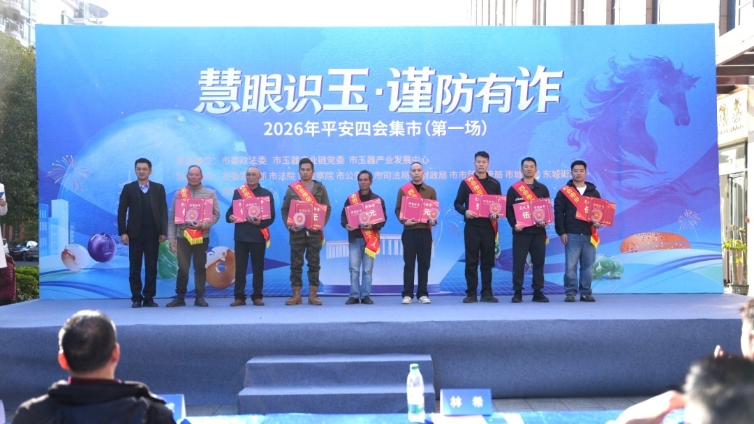 冬日暖阳映玉都,诚信清风护民生。1月8日下午,市委政法委牵头组织举办的四会市“慧眼识玉·谨防有诈”主题宣传活动(平安四会集市第一场)在玉博城拉开帷幕。四会市领导林希,市直有关单位和东城街道有关负责同志以及玉器商户代表、见义勇为先进个人、市民群众等参加活动。
